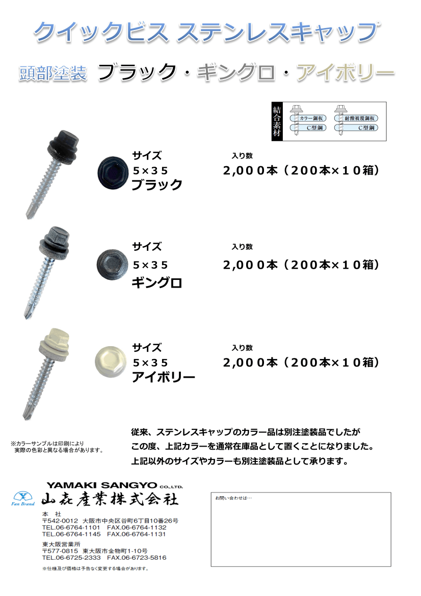 クイックビス(ドリルビス) ステンレスキャップ 5×35 頭部カラー (ブラック・ギングロ・アイボリー)