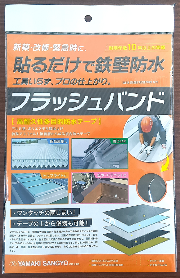 フラッシュバンドは、英国最大の接着剤・防水材メーカーであるボスティック社の国際的ベストセラー製品で、ワンタッチの雨じまい、建物の万能防水テープとして、長年にわたり重宝されています。施工面にただ張り付けるだけで失敗がなく、異質材料のジョイントのシールなども簡単に経済的にできるのが特徴です。雨じまいをはじめ、防水シール、修理、補強など建築分野全般にわたり、なくてはならないものとなっています。